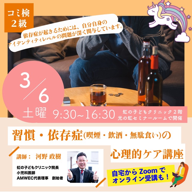依存症とは、タバコ、アルコール、食べ物、買い物、人などに心や体が依存し、それなしでは生きていけなくなる状態を指します。依存症が起きるためには、自分自身のアイデンティティレベルの問題が深く関与しています。身体的な反応の調整に加えて、アイデンティティレベル(本当の自分)のケアが必要です。 この講座では、NLP(神経言語プログラミング)という方法を用いて、アンカリングやBPOなど最新の心理ケアを教え、さらにアイデンティティレベルのケアを教えます。依存症で悩んでいるご本人はもちろん、悩んでいる方を助けたいという方、プロのカウンセラー等を目指している方にもオススメの講座です。 【開催日時】 2027/3/6(土) 9:30-16:30 講師紹介 講師:河野 政樹 (こうの まさき) 虹の子どもクリニック院長 小児科医師 AMWEC代表理事 創始者 (株)光の虹 代表取締役社長 全てのプログラムの製作者です。 AMWECコミュニケーション検定講座は5級から1級まであります。日常使いのコミュニケーションからプロのカウンセラーとして使える技術までを学んでいただけます。 AMWECの資格は、履歴書に記載することができる正式な資格です。 会場:光の虹セミナールーム (虹の子どもクリニック2階) 〒739-0041 広島県東広島市西条町寺家5022番1 JR寺家駅北口から東へ徒歩7分 ディスカウントドラッグコスモス寺家店向かい 主催・お申込み・お問い合わせ:(株)光の虹 TEL 082-426-3605 (10:00〜12:00, 15:00〜17:00) FAX 082-426-3606 (24時間OK) E-mail: [email protected] ※お申込み及びキャンセルされる場合は前日営業日までにご連絡をお願い致します。当日やむを得ない理由によりキャンセルされる場合も、上記電話番号まで必ずご連絡ください。 ※キャンセルポリシーについては、「特定商取引法に基づく表記」の「返品についての特約に関する事項」に記載しています。お申込みに伴い、全ての事項の内容に同意した扱いとなります。