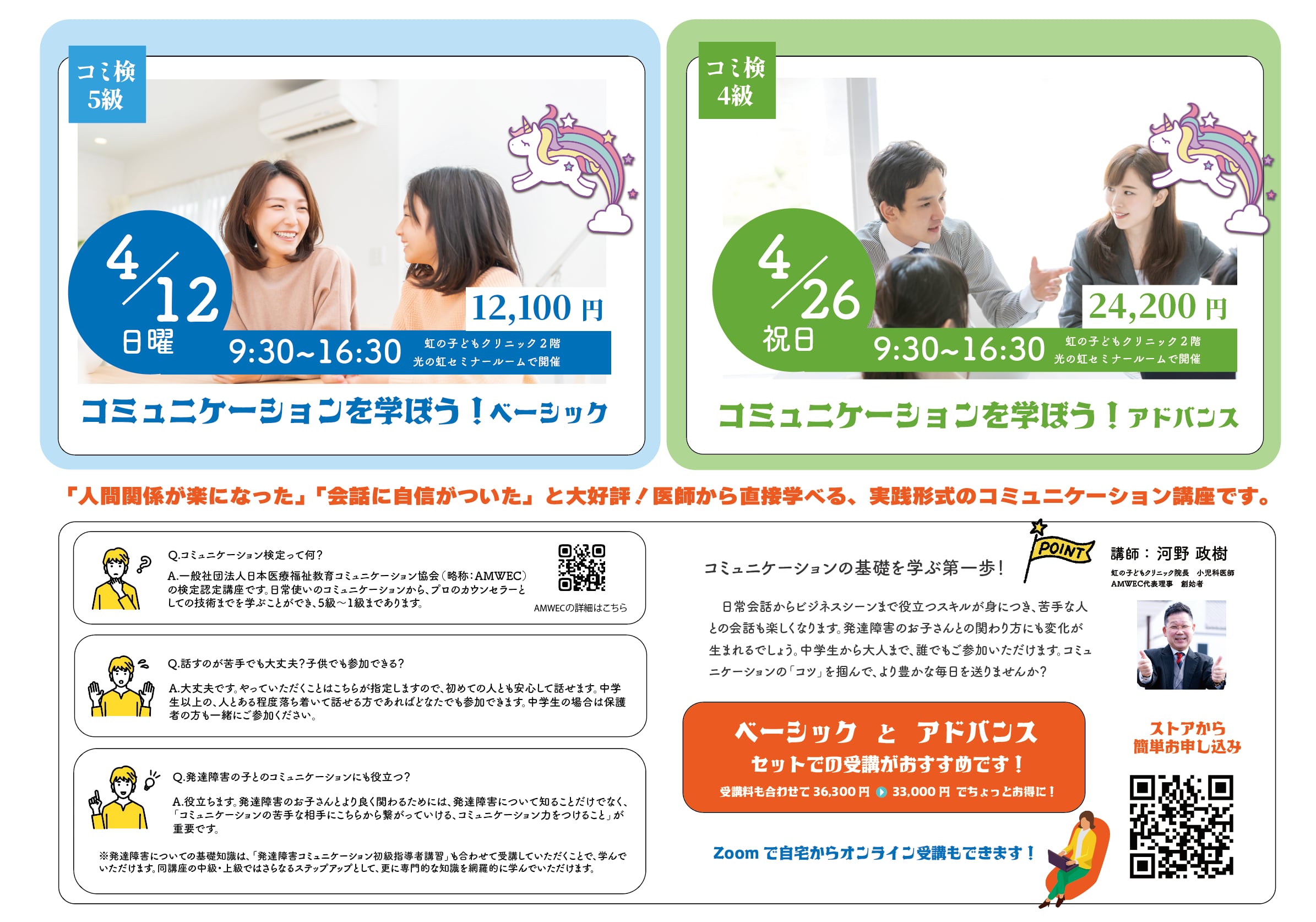 AMWEC(一般社団法人日本医療福祉教育コミュニケーション協会)認定のコミュニケーション検定は、日常使いのコミュニケーションから、プロのカウンセラーとしての技術までを学べるセミナーで、5級〜1級まであります。