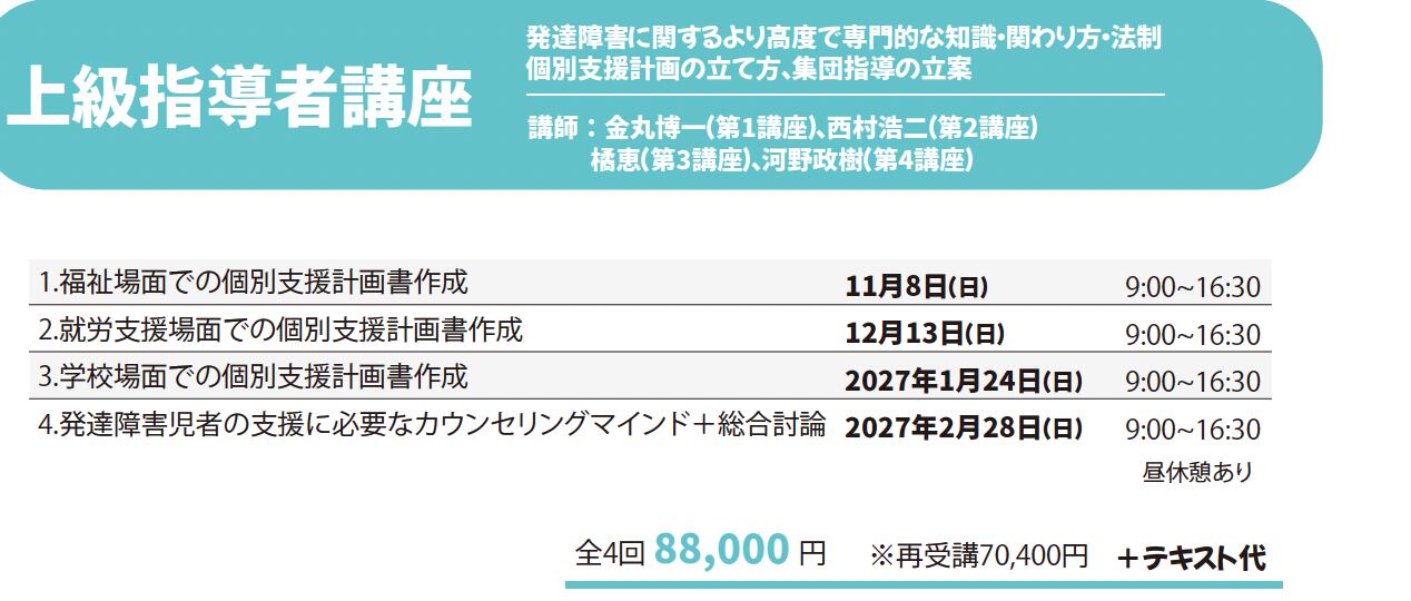 臨床に近く、個別・集団支援の計画作成、相談業務・指導を含む上級講座は、